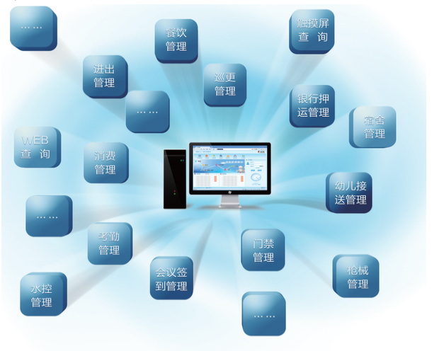 系統(tǒng)以一卡通管理系統(tǒng)為核心,通過(guò)網(wǎng)絡(luò)連接各功能模塊構(gòu)成系統(tǒng)的基本框架,由于系統(tǒng)按模塊設(shè)計(jì),可根據(jù)管理和發(fā)展的需要量體裁衣,分步實(shí)施,任意增減功能和擴(kuò)充規(guī)模。
